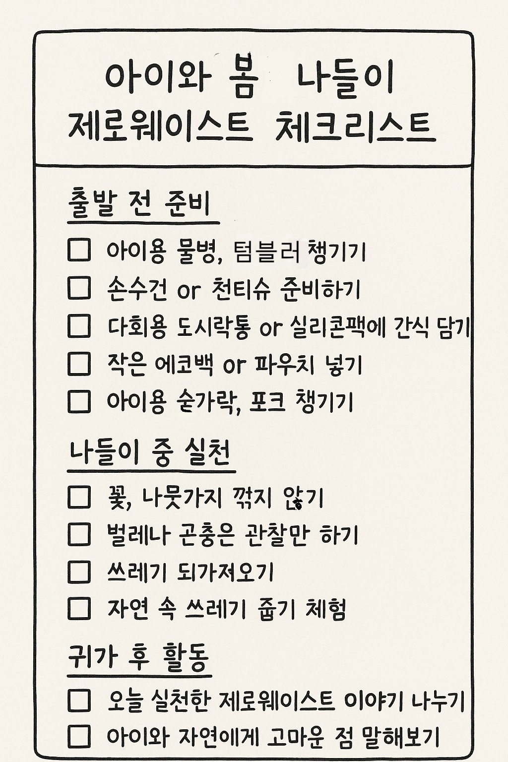 출발 전부터 귀가 후까지! 제로웨이스트 체크리스트를 활용해보세요.
